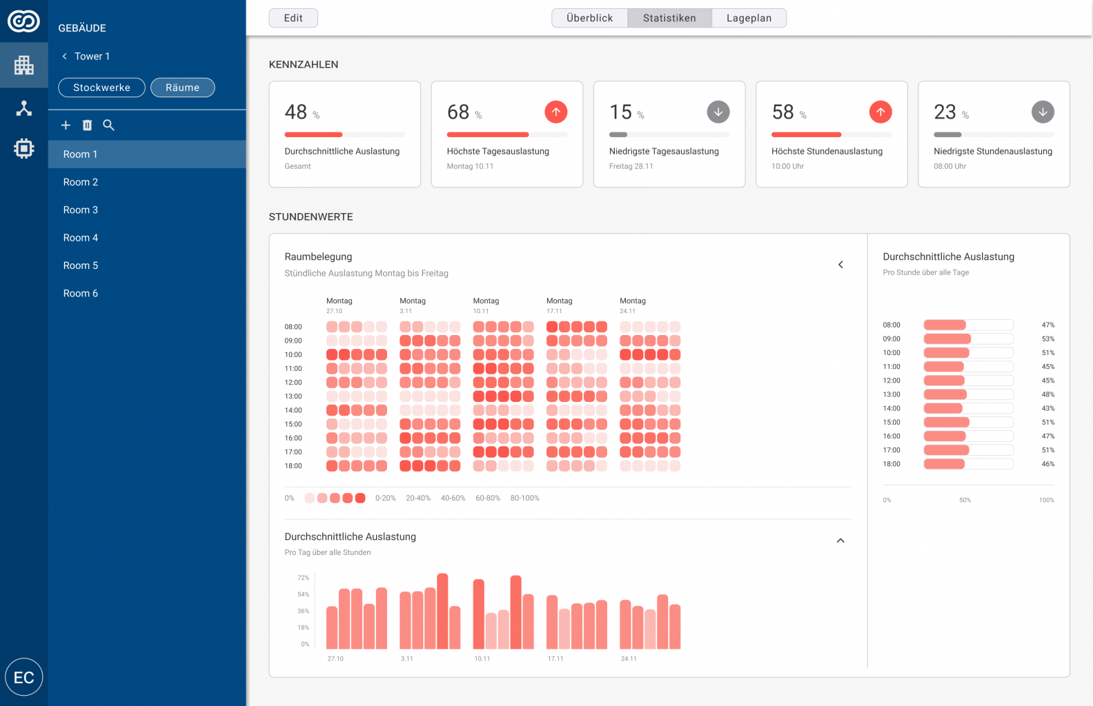 Using data from movement sensors and room bookings, I defined a concept that enables facility managers to visualize room and floor occupancy. This allows them to make informed decisions about renting more or less office space for their company.