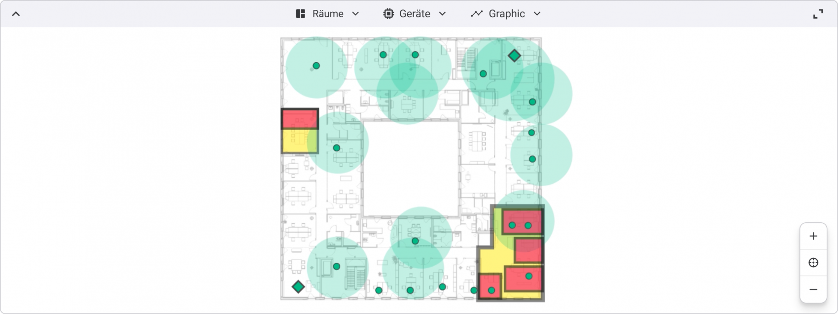 I defined interaction patterns that allow users to create and adjust room and zone boundaries on floor plans, and to visualize and manage the locations of automation devices within each space. I also designed controls to activate or deactivate real-time data overlays on the map, such as movement and temperature graphs, and defined a color concept to ensure consistent and intuitive visual feedback across the graphics.