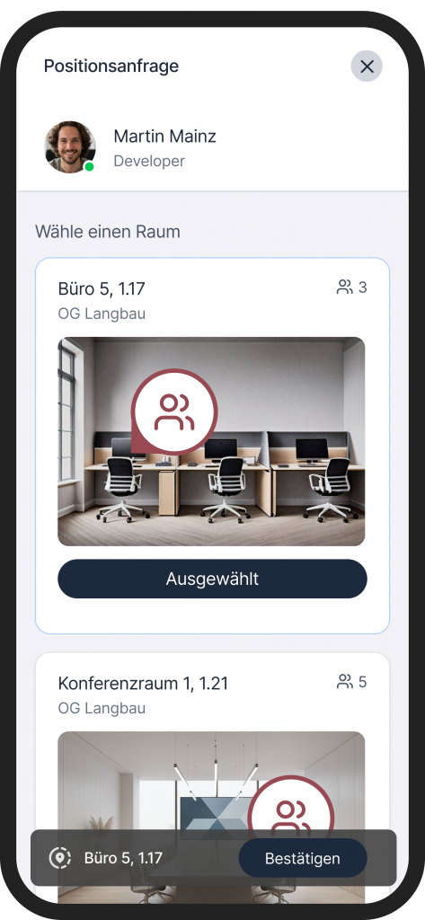 As a proof of concept for future features in the Lucas App, I was asked to define a concept for locating colleagues within large buildings. The idea required integrating Microsoft Office single sign-on, requesting user permission to share their location when a request was sent, notifying them about incoming requests, and allowing them to respond with a timestamp and a selected room where they were located.