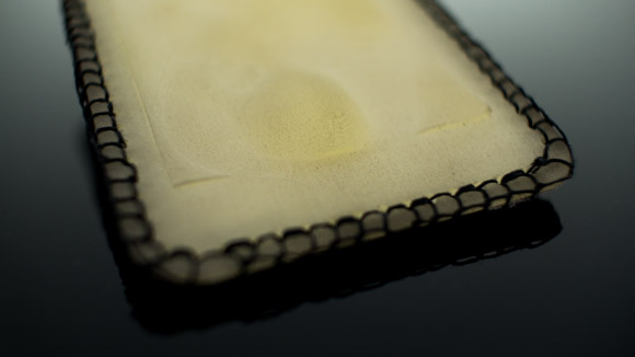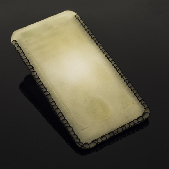 “Between Monsters and White Collar Criminals” makes the tactile relationship between user and device, explicit: fingerprints and greace on the display. By means of a fingerprinting powder and a UV lamp the fat shadow of the touch is made visible, scanned and translated into a digital model. This is then printed three-dimensionally on the front side of the smartphone sleeve and thus reveals a moment of the hidden relationship between user and device.