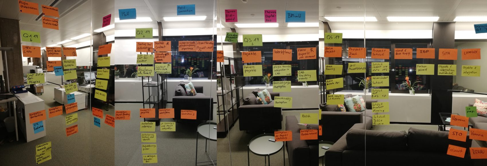 The roadmap activity was a split by roles. First the product owner created a section for each year quartal. And placed the key features of the different products as he though they should follow. Then the developers added post its on what needed to be done in order to build this key features and adapted the dependencies and order, then marketing brought the perspective of the showcases and events where we had deadline for presenting our innovations and then we all added operative tasks that were needed for us to survive as a business (finishing contracts with clients, improving processes to be faster in repetitive work).